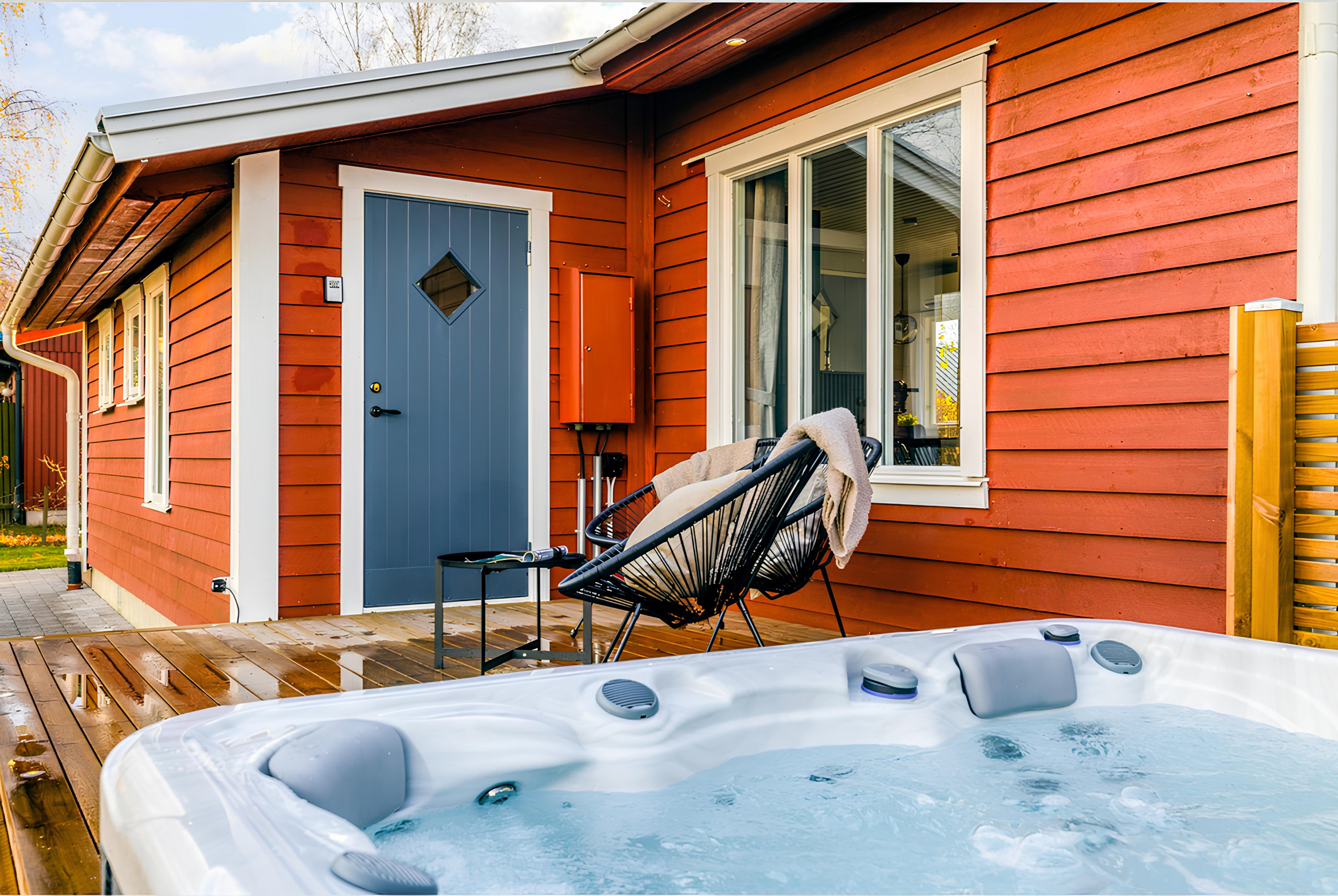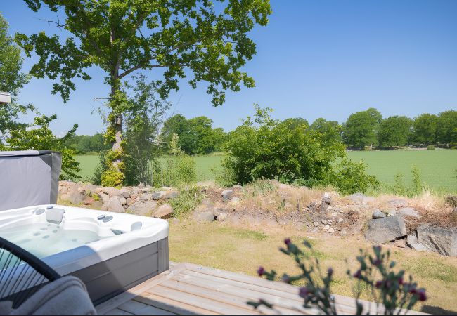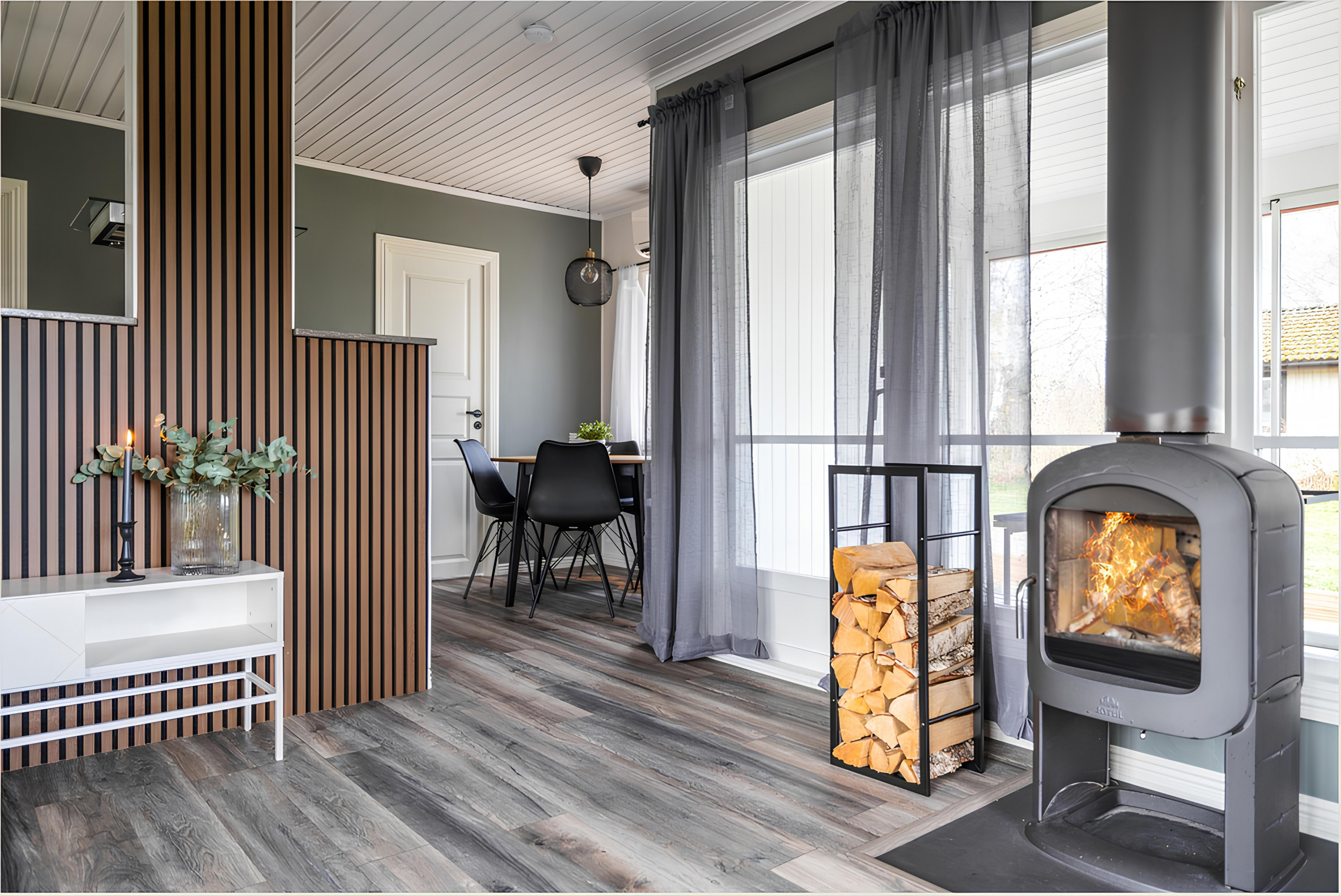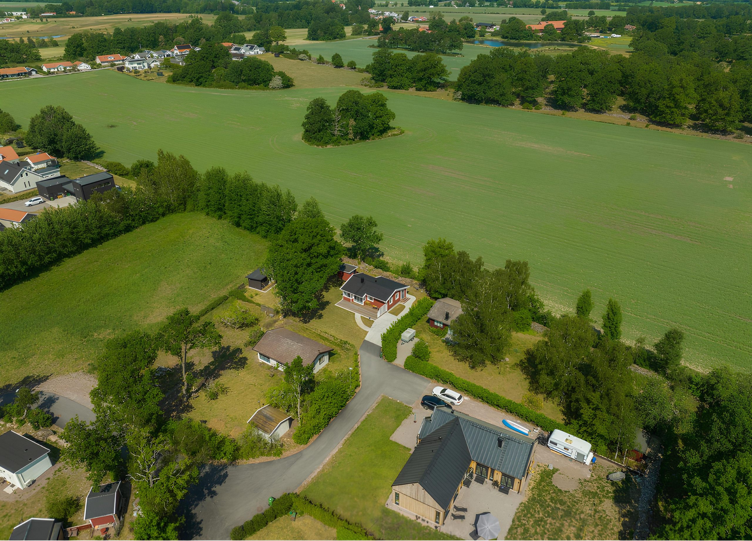 Den här stugan ligger med ett rofyllt läge med insynsskyddad baksida mot ett åkerfält. Invändigt finner ni ett vardagsrum med braskamin och en bäddsoffa, ett fint kök i öppen planlösning med vardagsrummet, två sovrum med enkelsängar samt ett badrum utrustat med både dusch och tvättmaskin. Från vardagsrummet når ni ett stort inbyggt uterum som ni kan vistas i om det är dåligt väder. På baksidan som ligger mot åkerfältet finner ni ett SPA som är kringbyggt med en terrass. Tomten är bra för olika aktiviteter, då den är plan och inte kuperad. Intill huset finner ni ett annex med en säng för två personer. På några minuter når ni den lilla havsviken.