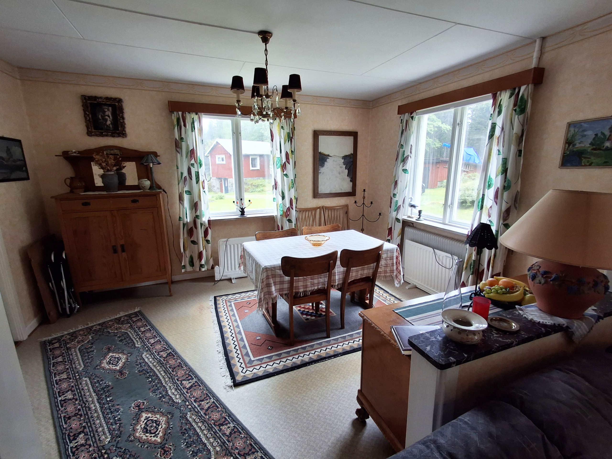 Huset har två sovrum – ett med dubbelsäng och ett med två enkelsängar – samt ett fräscht badrum med dusch och WC. I vardagsrummet kan du koppla av i soffan framför TV:n eller njuta av sprakande eld i den öppna spisen.