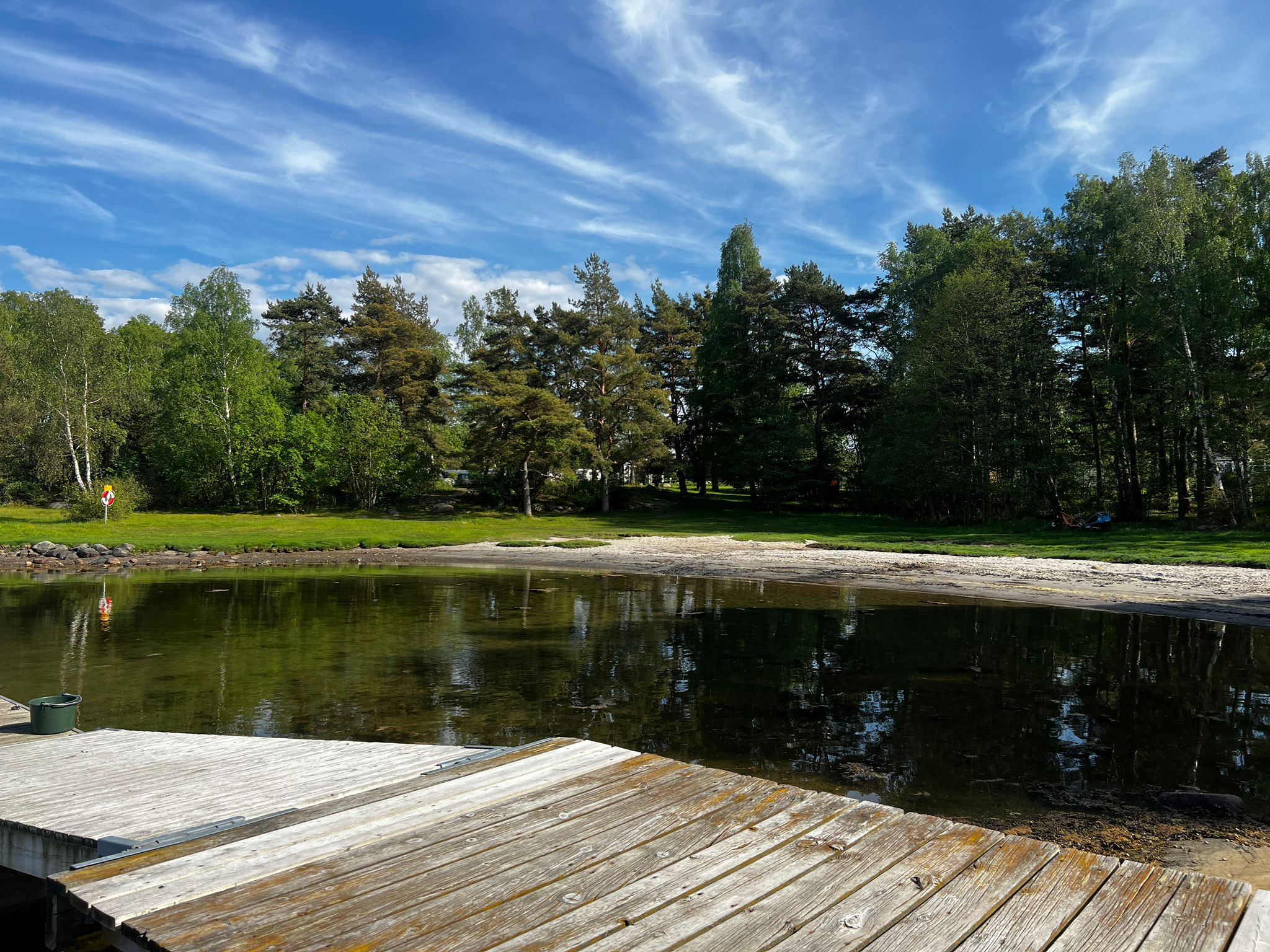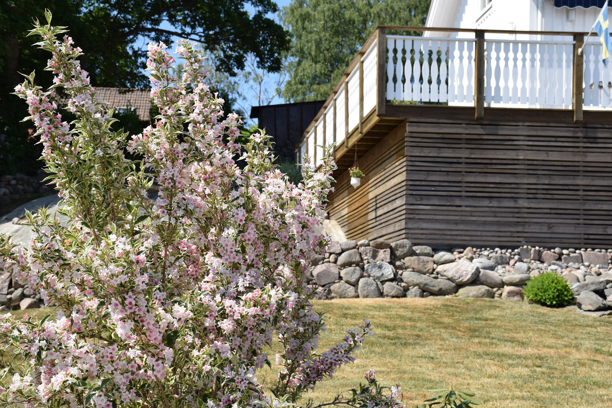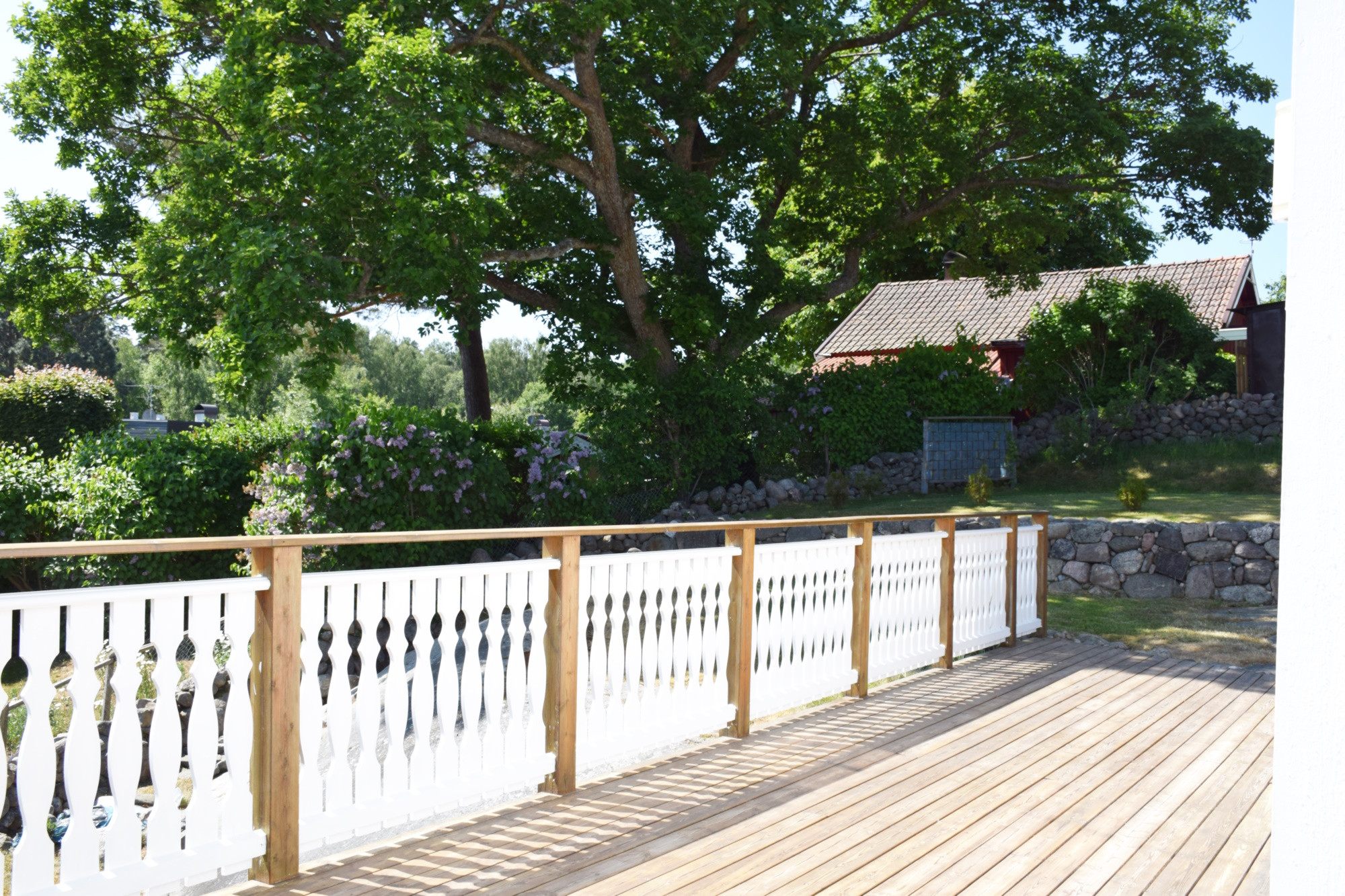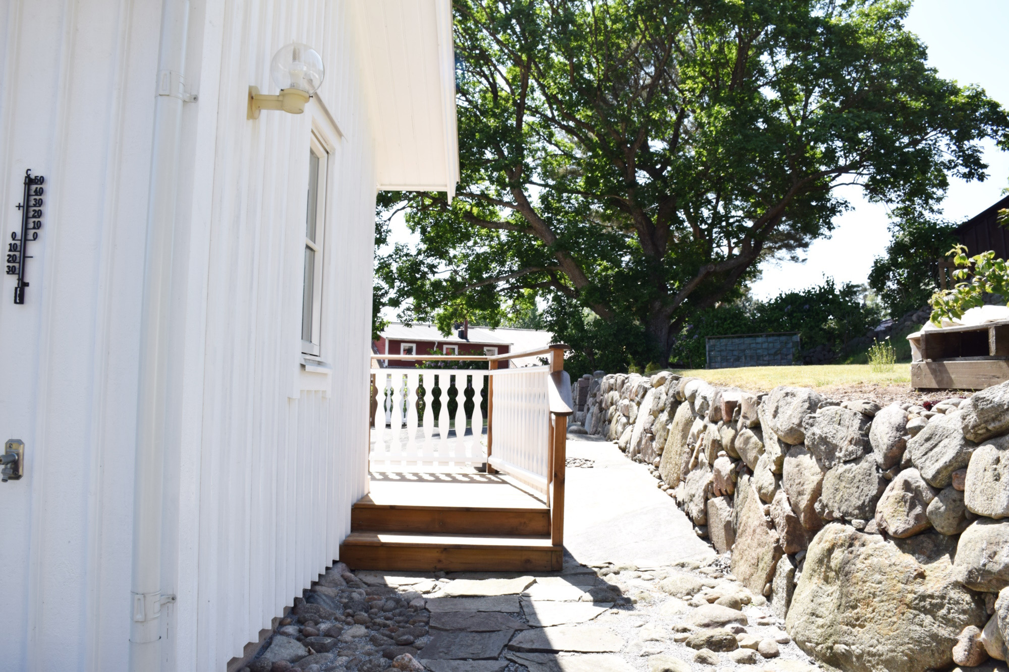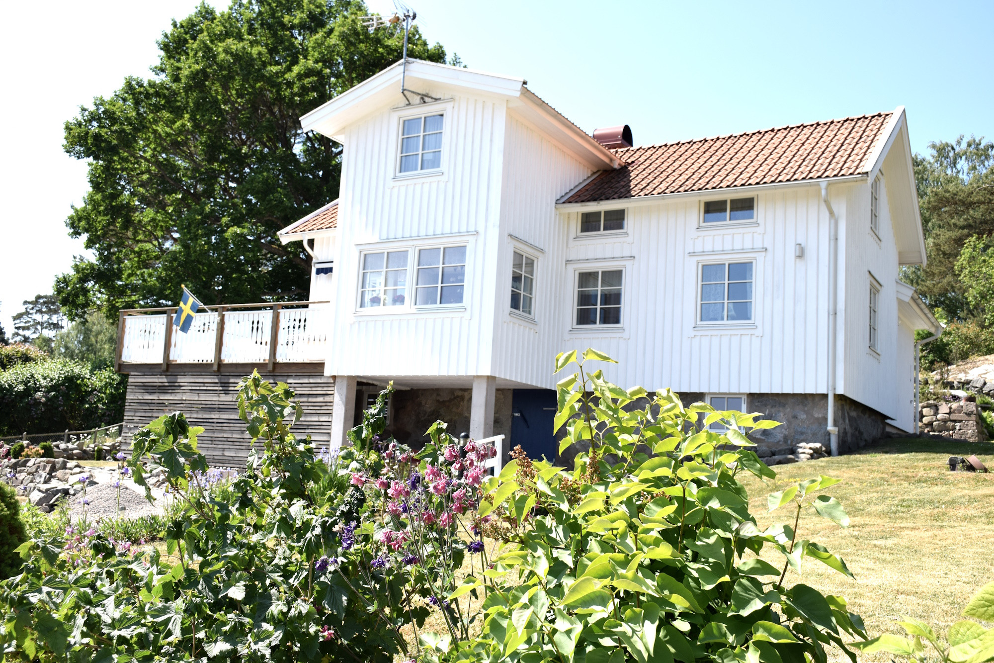 Den vackra trädgården är perfekt för lek och avkoppling. Här finns utemöbler, parasoll och grill, och på baksidan kan ni njuta i skuggan under varma sommardagar. Morgon- och kvällsdoppet ligger bara 250 meter bort, och på gångavstånd finns både naturstrand (1 km) och badplats med hopptorn (1,5 km).