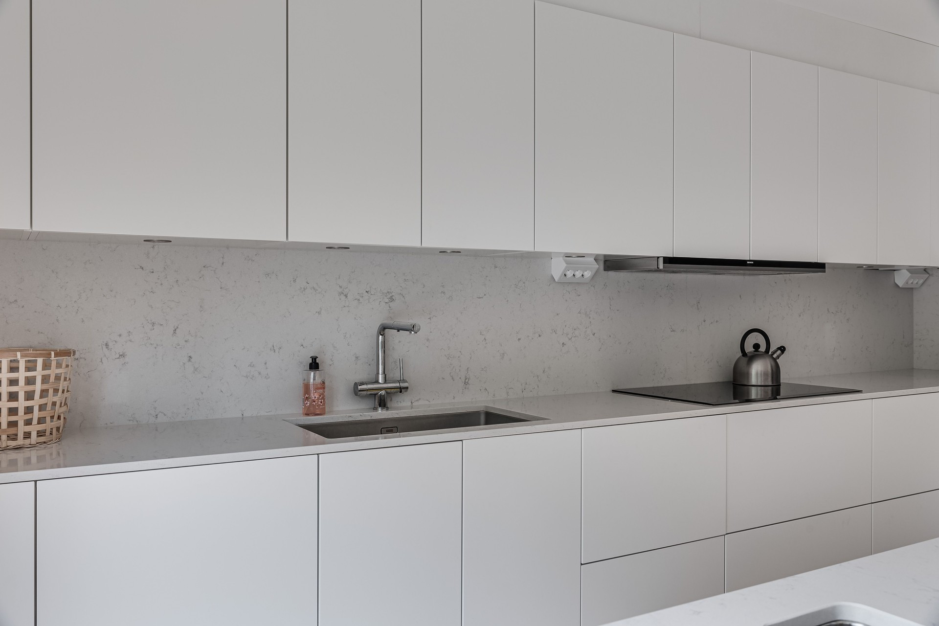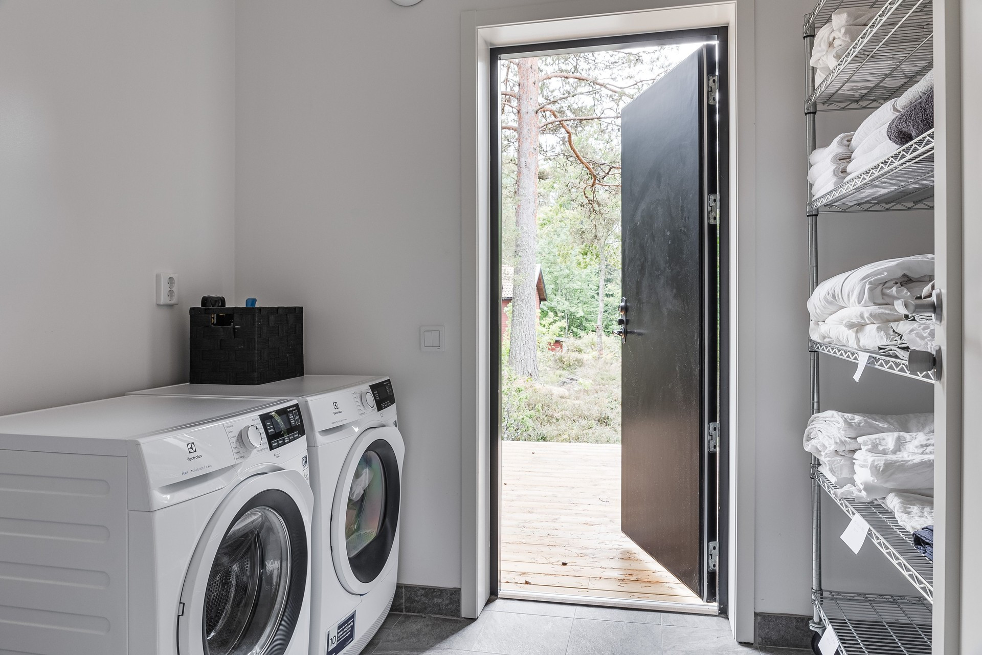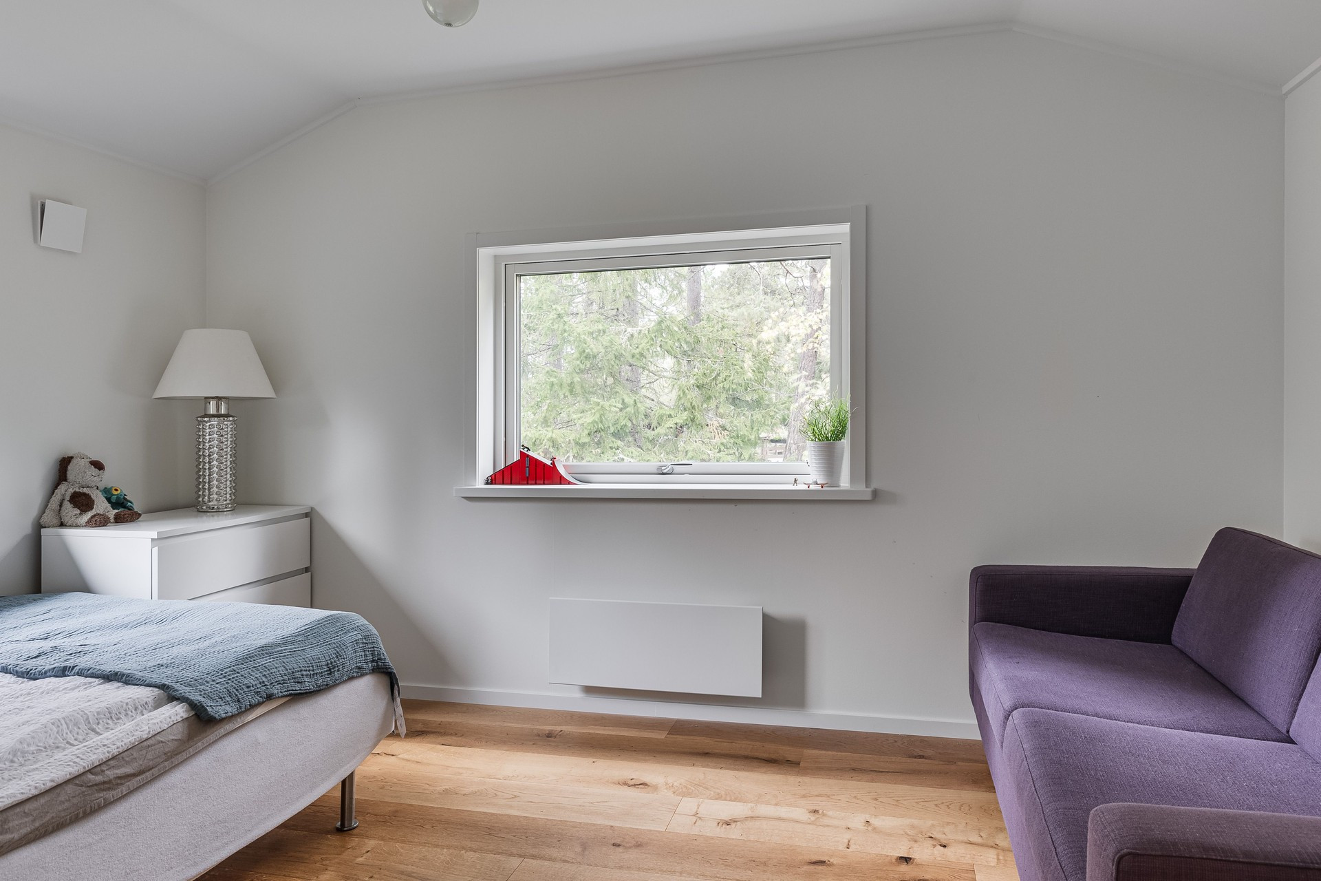 Huset har fyra sovrum. Mastersovrummet är utrustat med en dubbelsäng på 1,80 m samt ett justerbart skrivbord för arbete. Ett sovrum har en våningssäng med plats för upp till tre personer. De två övriga sovrummen har dubbelsängar på 1,40 m vardera, varav det ena även har skrivbord och datorskärm. Här finns ett stort och modernt fullt utrustat kök, anpassat för stora middagar och bakning, samt ett rymligt vardagsrum med stor soffa som vetter mot skogen och en glimt av sjön. Huset har två helkaklade badrum i naturgranit, med både dusch och badkar. Dessutom finns separat tvättstuga med tvättmaskin, torktumlare och egen groventré. För en behaglig temperatur året runt finns två värme- och AC-pumpar. Fiberinternet, TV med Google Chromecast, bioljud och HDMI-anslutning samt två dedikerade arbetsplatser gör huset väl anpassat även för arbete på distans. För lugna dagar och kvällar finns gott om sällskapsspel och böcker.