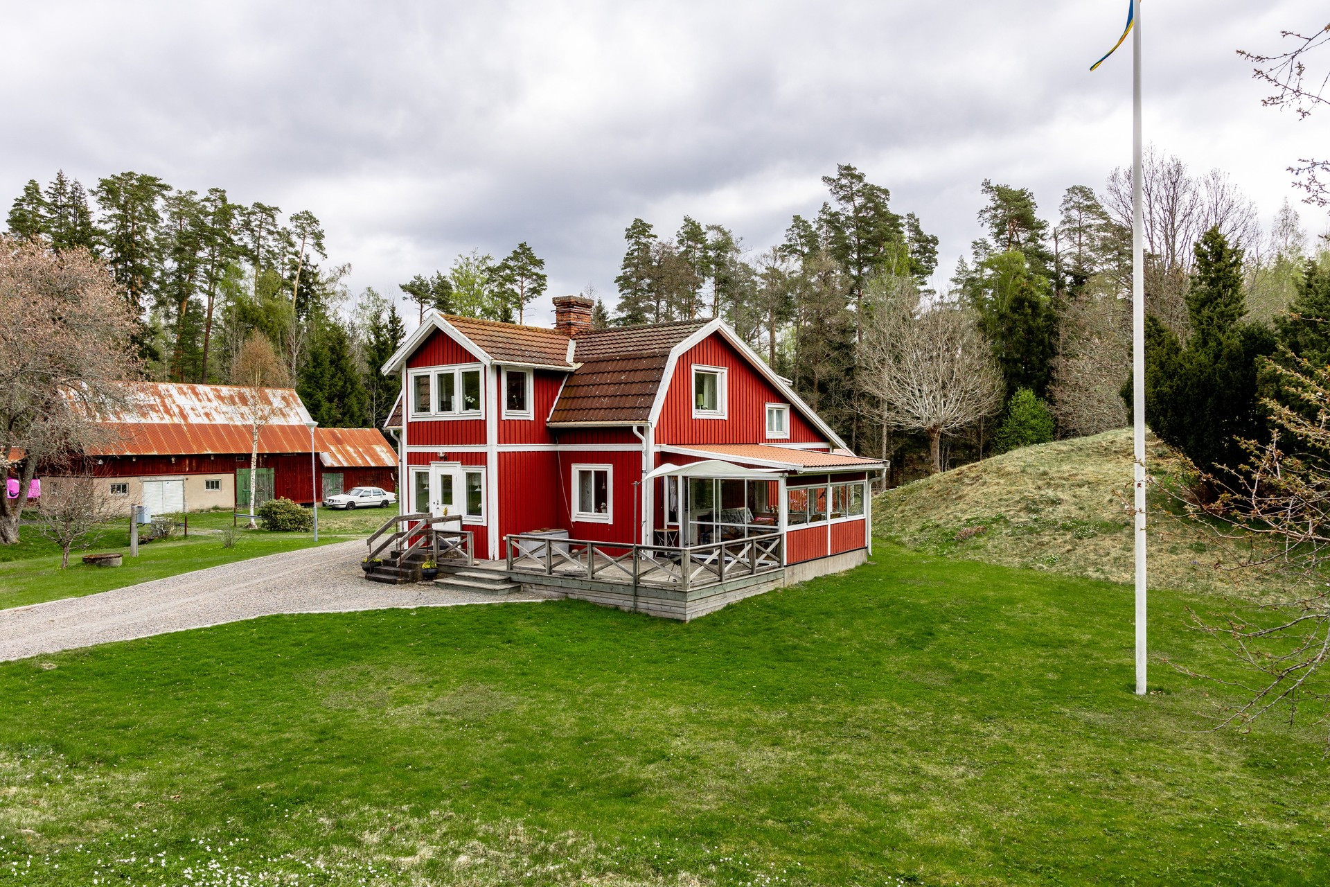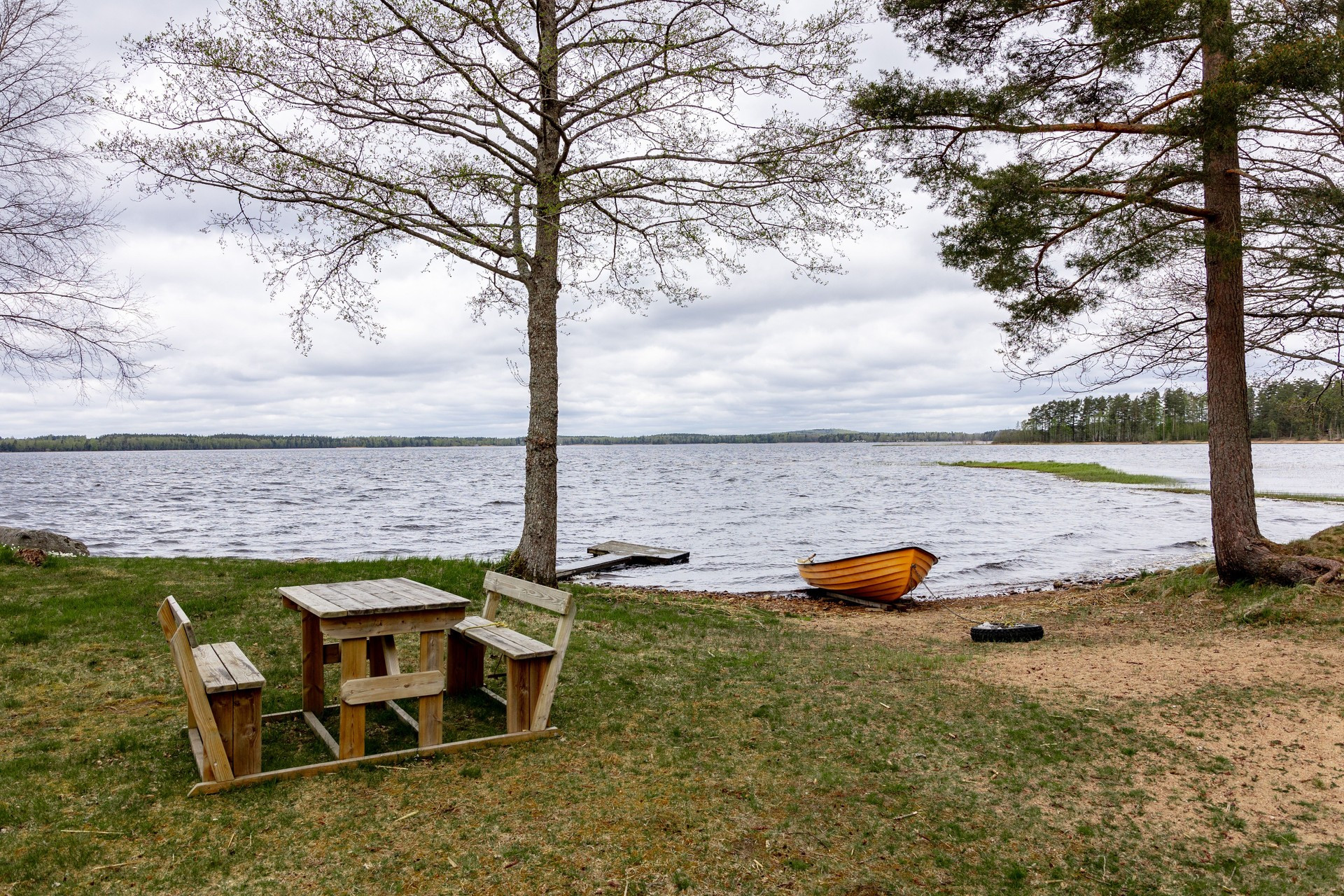 Ute i den stora trädgården finns gott om plats för picknick, lek eller bara en lugn stund i naturen. Här hittar du även en grillplats med utemöbler idealiskt för att avnjuta middagar medan solen går ner över sjön. Stugan är välplanerad med två våningar och har dessutom en extra dusch i pannrummet för din bekvämlighet.