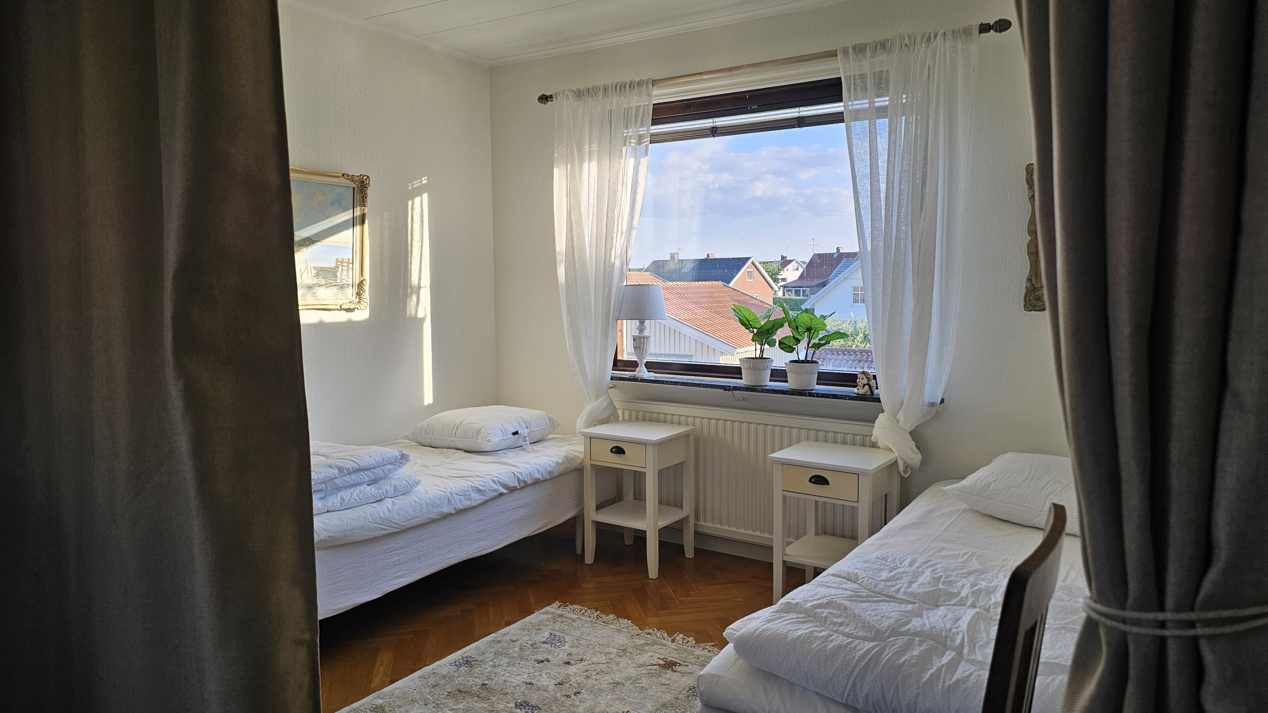 Detta hemtrevliga boende i centrala Skärhamn består av två separata lägenheter som tillsammans erbjuder fem sovrum fördelat på tre plan och totalt tolv ordinarie bäddar. Ett av sovrummen fungerar som ett genomgångsrum och är möblerat med fem enkelsängar. Boendet har två badrum med dusch och en enkel men funktionell inredning som för tankarna till klassiskt sommarhusliv med äldre charm. Om man vill nyttja alla sängar maximalt och kan tänka sig att sova två personer i en 140 cm bred säng, finns möjlighet att rymma upp till tretton gäster. Här bor du nära havet och hamnens liv, samtidigt som du kan njuta av det stilla tempot i ett lugnt område. Ström ingår, och husdjur är välkomna efter förfrågan, vilket gör det till ett trevligt alternativ även för fyrbenta familjemedlemmar.