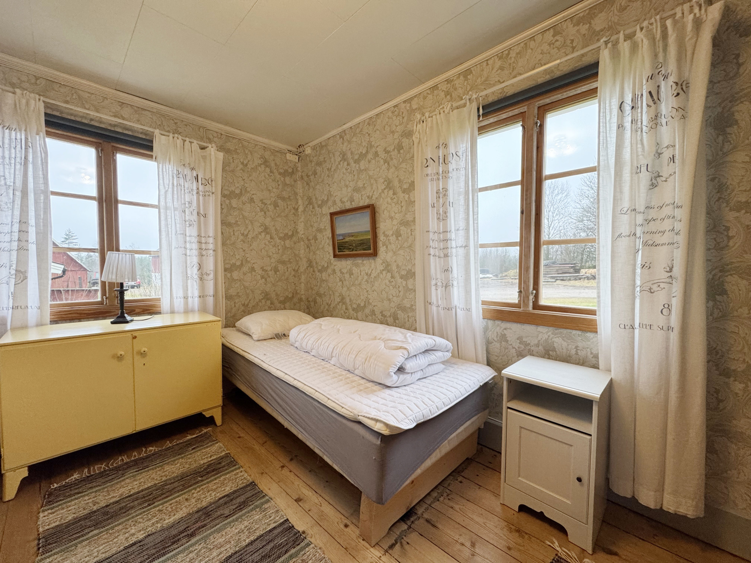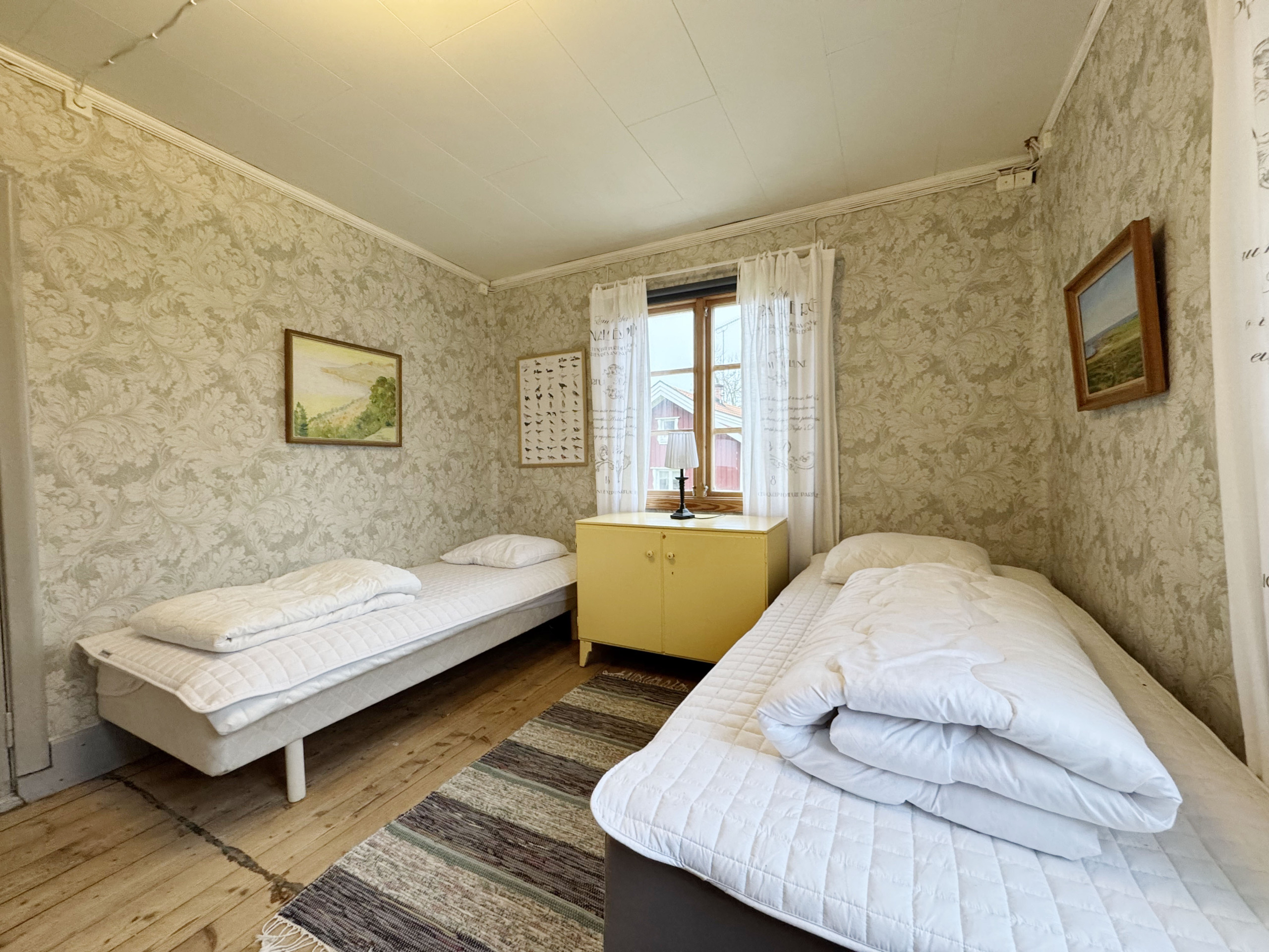 Vackert hus som är varligt renoverat till modern standard. På första våning finner ni ett av sovrummen med två enkelsängar för vuxna och en enkelsäng för ett barn under 12 år. Här finns också badrummet med med dusch och tvättmaskin. Funktionellt kök med matplats och en gigantisk gammal vacker murstock med järnspis som går att elda i. Vardagsrummet eller salen som det hette förr har trägolv och tidsenligt möblemang och här äta mysiga middagar framför den vackra kaminen. Går ni upp för den branta trappan till andra våningen finner ni ytterligare två sovrum. Ett med dubbelsäng och ett med två enkelsängar. Husets höjdpunkt är väl ändå biljardrummet med bar. Varför inte utmana varandra i ett parti en kväll samtidigt som ni njuter av värmen från en skön brasa. Här är det högt i tak och härlig mysfaktor.