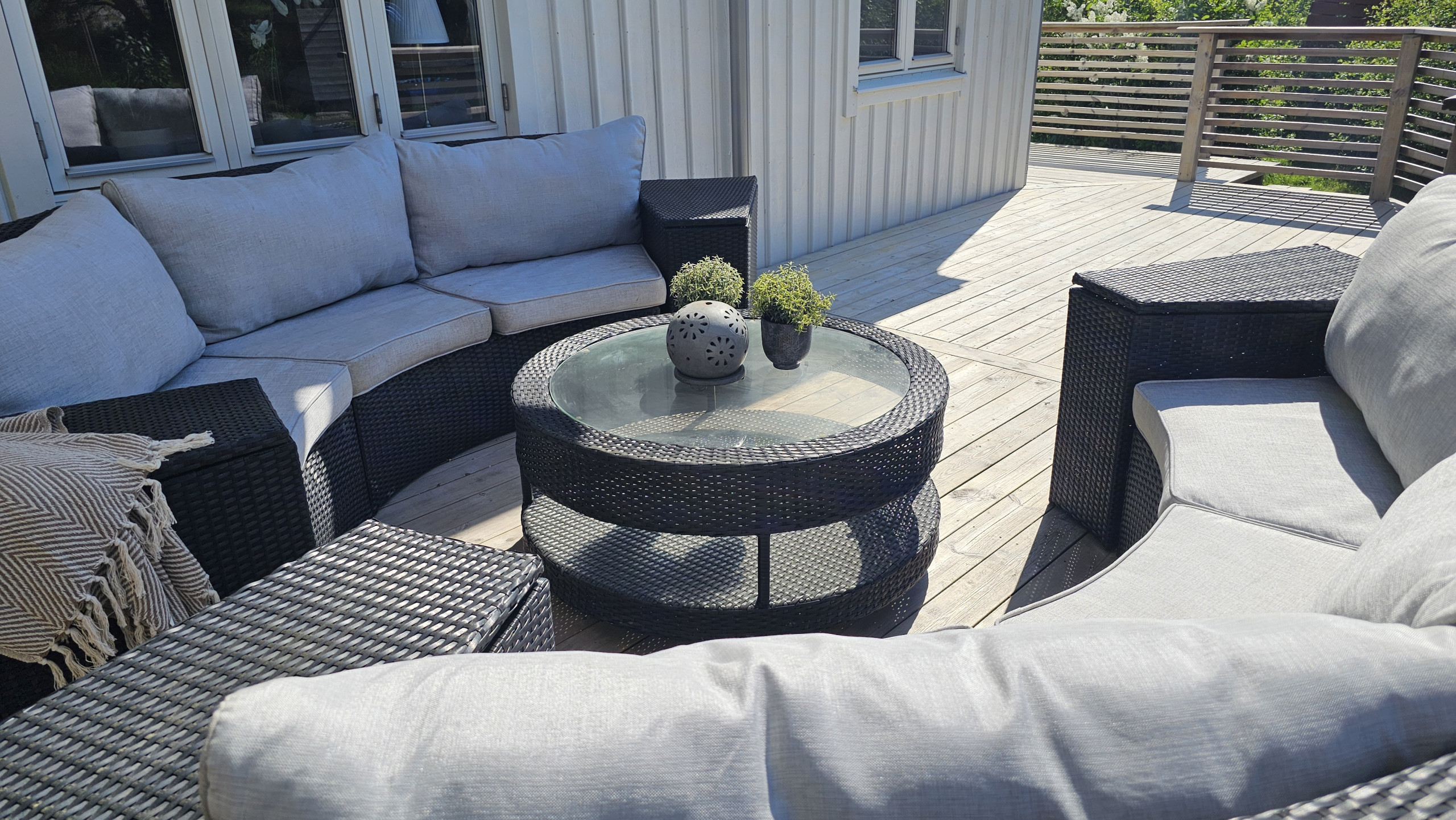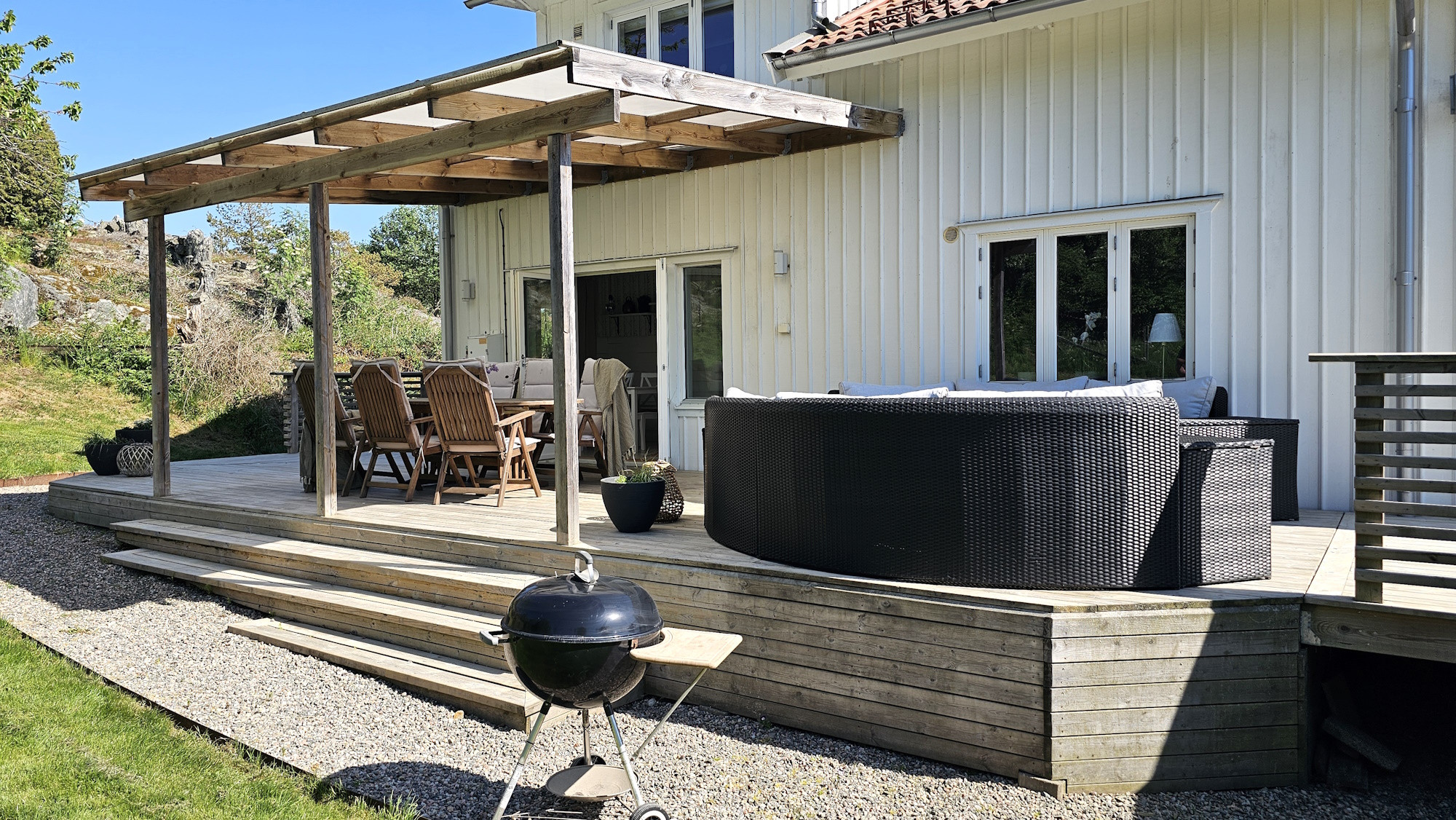 Den inbjudande altanen på baksidan är som gjord för sommarkvällar med grill och gemenskap, och på gården finns även en mysig kåta/eldplats som kan hyras av ägaren. Huset ligger nära både hav och bad, bara två kilometer till en vacker naturbadplats.