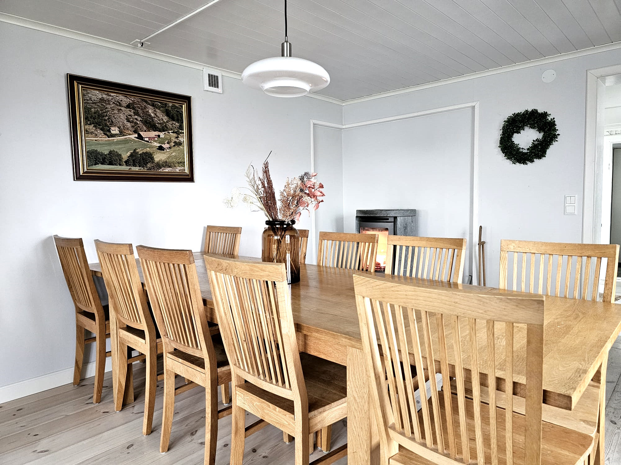 Välkommen till detta idylliska hus på landet, omgivet av ängar, hästar och highlandkor – en plats där lugnet och naturens skönhet står i centrum. Här bor ni bekvämt med plats för upp till 10 personer fördelat på tre sovrum och två allrum. Huset bjuder på en hemtrevlig atmosfär med välutrustat kök, kamin, två badrum och bekväma sängar för hela familjen. Wi-Fi och Chromecast finns för lata kvällar, och på den stora tomten väntar gräsmatta, gungställning och rutschkana – perfekt för barnens lek.