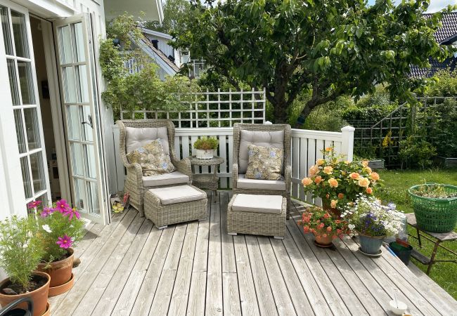 Semesterbostaden är belägen i ett etablerat lugnt villaområde har, i huvudsak insynsskyddad, lummig trädgård i lä med plats för matstunder vid grillen lek och avkoppling.