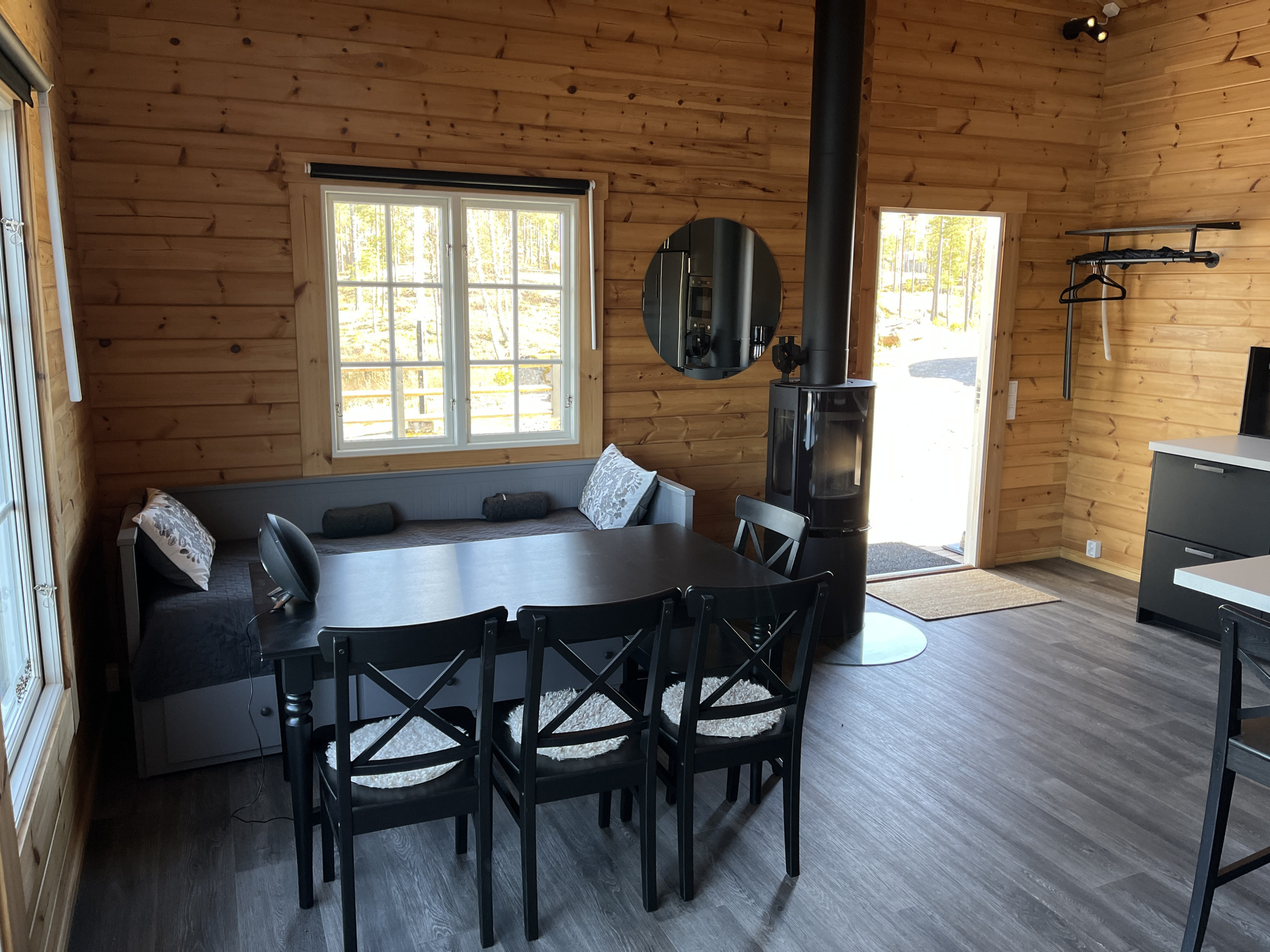 Stugan har en öppen och luftig planlösning mellan kök och vardagsrum. Det lantliga köket är fullt utrustat med spishäll, ugn, mikro samt kyl- och frysskåp. Från både köket och matplatsen har du en fantastisk vy över sjön. Matplatsen rymmer en bäddsoffa för två personer, och via dubbeldörrar når du direkt ut till altanen. I vardagsrummet finns ytterligare en bäddbar soffa för två samt TV.
