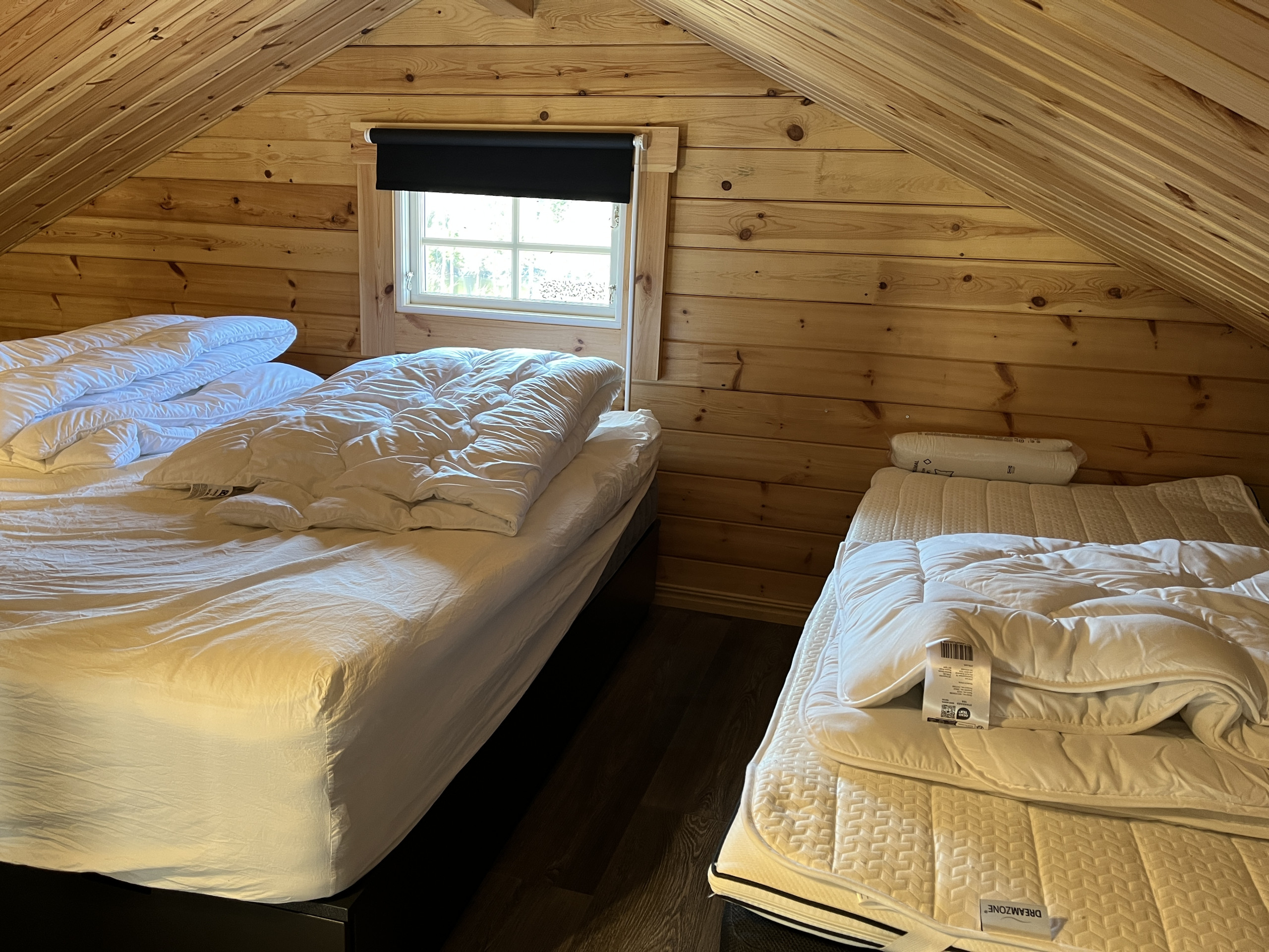 Badrummet är modernt och fräscht, utrustat med dusch, toalett och tvättmaskin. Sovloftet nås via en trappstege och erbjuder en dubbelsäng samt en enkelsäng. För mysiga kvällar finns en braskamin – perfekt under kyligare dagar. Observera att laddning av elbil ej är tillåten.