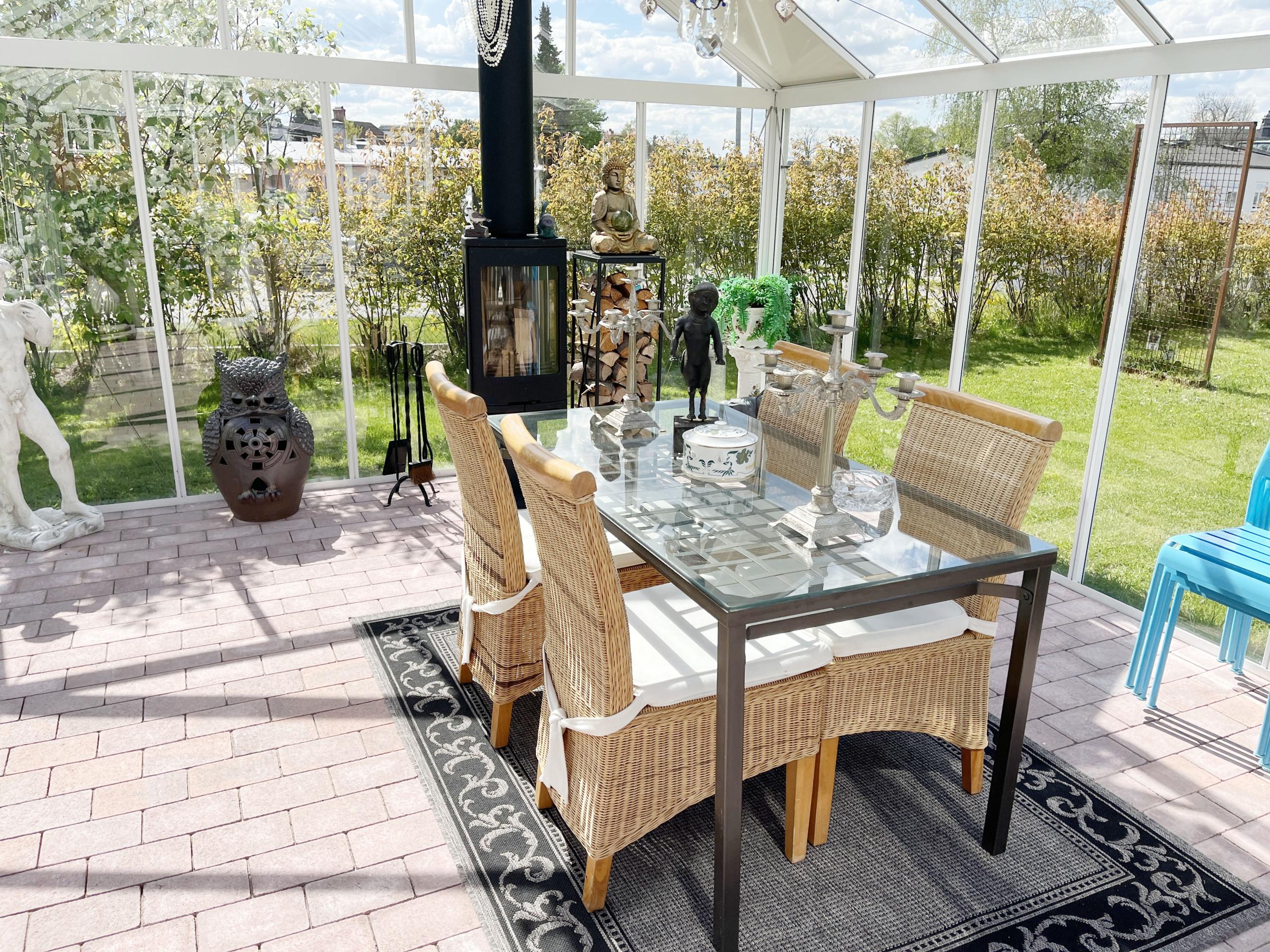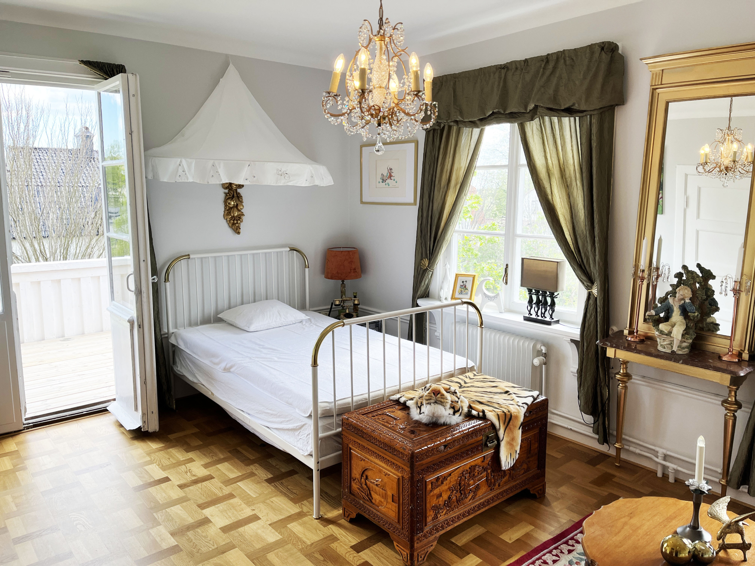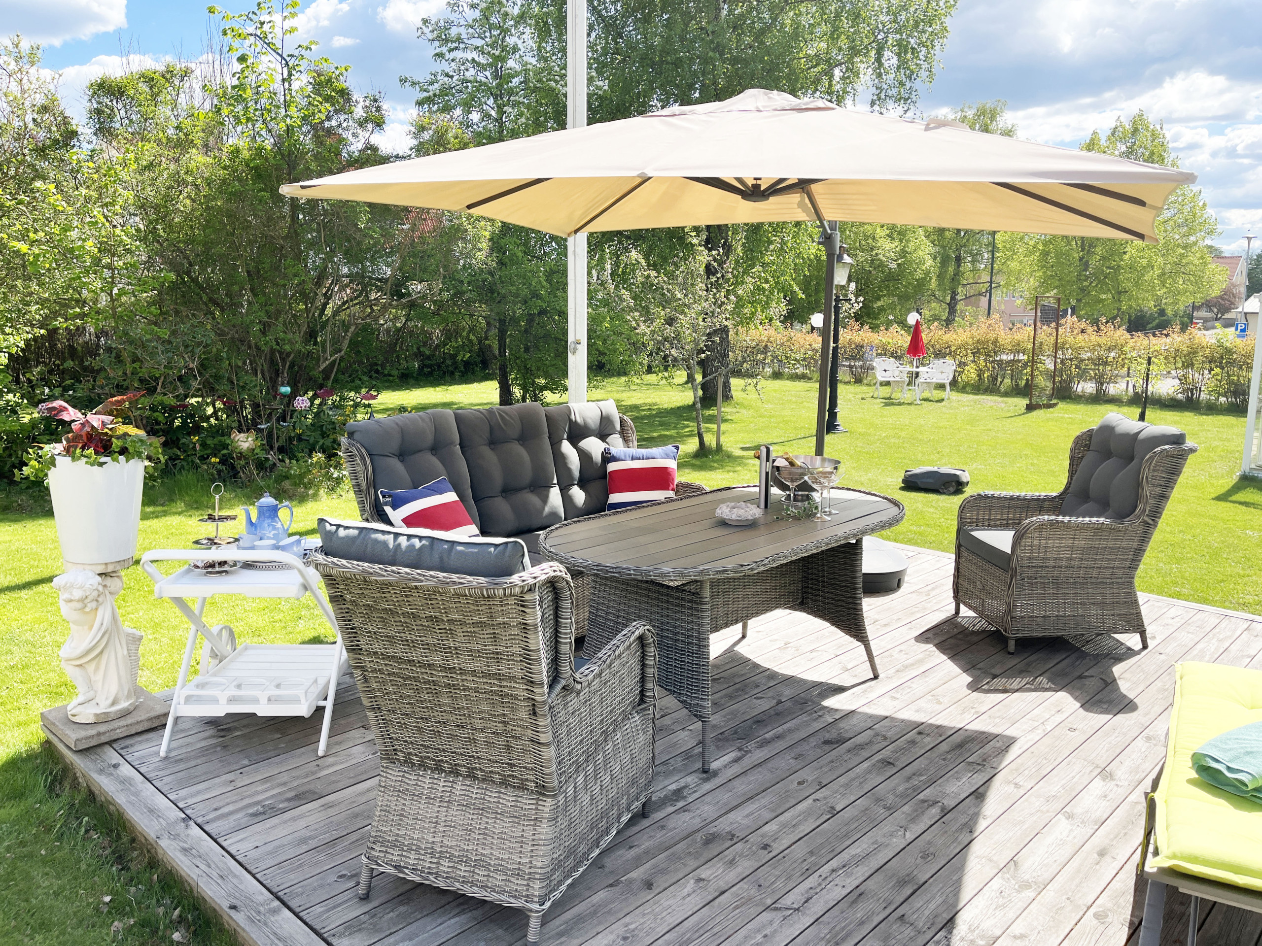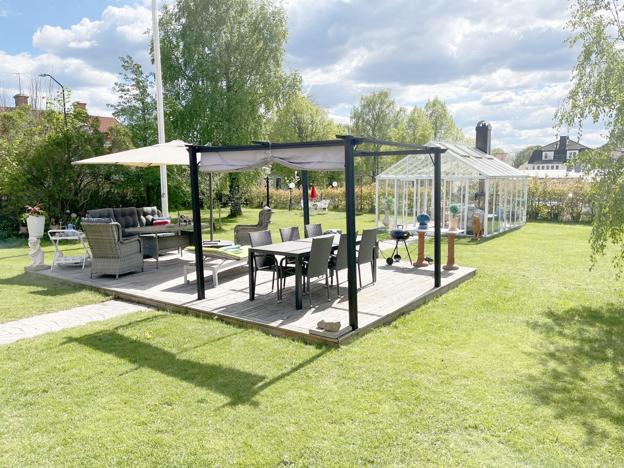 På övre våningen finner ni två sovrum möblerade med dubbelsängar, ett sovrum med bäddsoffa för två personer och det ett sovrum med två enkelsängar. Två möblerbara balkonger. Stort helkaklat badrum med badkar samt en separat toalett. Tomten är rejäl där ni kan spela fotboll eller ägna er åt andra bollaktiviteter. Här finner ni även den möblerade växthuset, där ni kan sitta på kvällarna och koppla av.