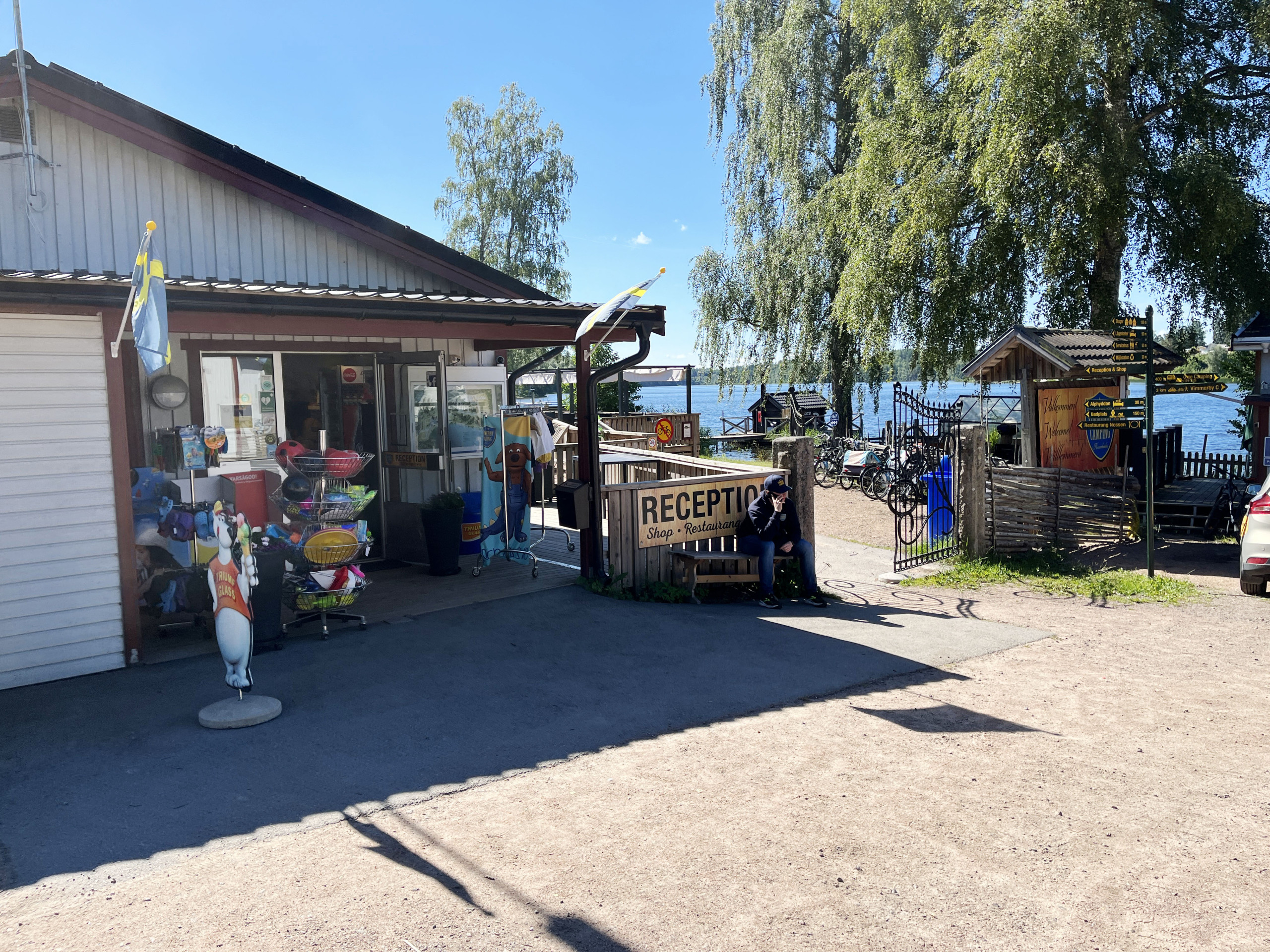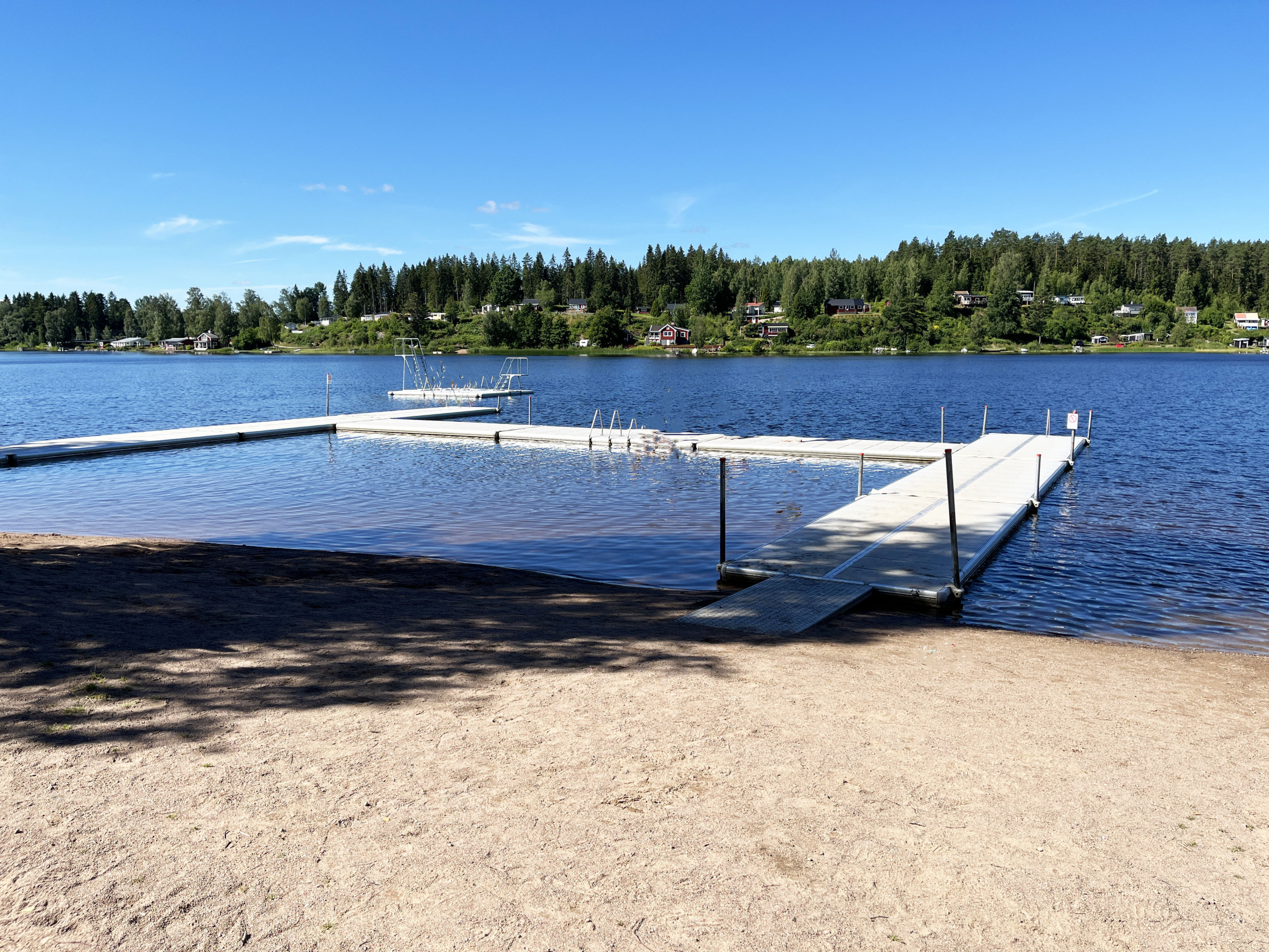 För badsugna ligger en långgrund och barnvänlig sandstrand vid sjön Gissen bara ett par hundra meter bort.