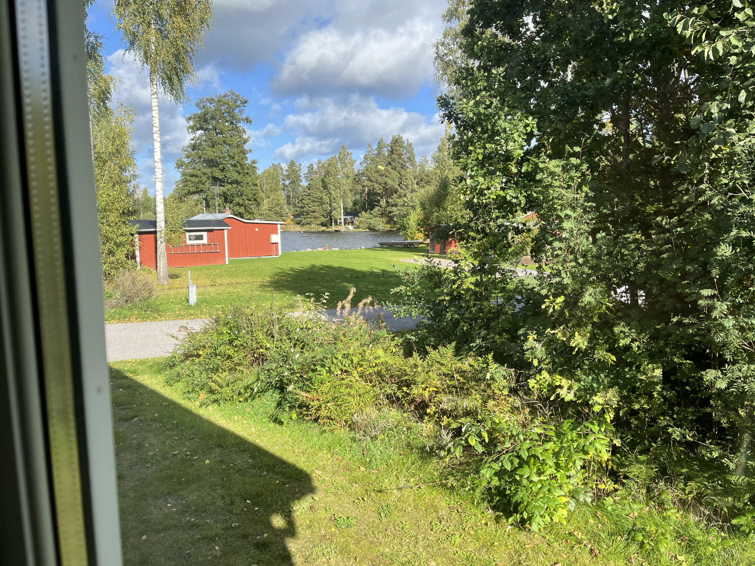 Via altanen på framsidan når ni entrén. Till höger om hallen finner ni badrummet som är utrustat med både dusch och tvättmaskin. Sedan till vänster når ni vardagsrummet som är bekvämt möblerat och har en öppen spis. Intill finner ni köket som via altandörren leder er ut till ett stort altandäck, där ni kan sitta och umgås på dagarna. Även på framsidan finns ett altandäck. Från båda har ni viss utsikt över sjön. Tomten är bra som ni kan nyttja till flertalet olika aktiviteter.